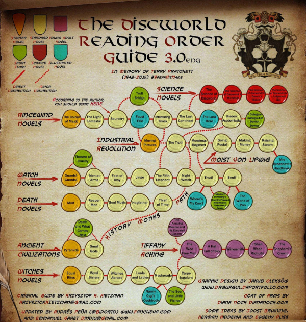 In 2011 I discovered the works by Terry Pratchett via a friend of mine who recommended them to me. The Discworld series intrigued me because it was not a straightforward series. It requires a map, a guide, an order. I’m sure that when the works came out since 1983 people simply read the next book as they came out so one can definitely read them in the order that they were published. However, my friend shared a map/guide with me that has been super helpful in figuring out which book to read next. From that guide (which I can’t actually find anymore because it’s outdated) I created the following guide for myself: